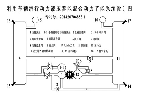 First, disconnect the transmission power shaft after the installation of a directional coupler, avoid energy storage system when engine fuel consumption and drag loss of power; two, in the end of the power input coupler, an output shaft 13 and gear pump 1 through three, at the same time in gear connection; coupler end power input and output shaft 13 and motor oil 12 through the gear connection.