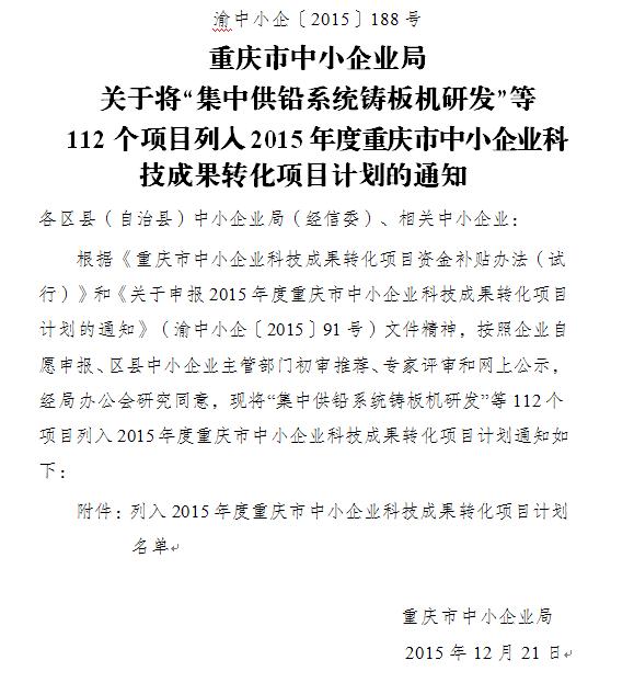 多年以来,重庆城建经济(集团)重庆绿色科技开发有限公司与重庆房地产职业学院进行产学研合作,坚持创新发展,研发了“中国创造”“互联网+多色温防雾霾亮度可调智能控制系统及LED智能灯具”技术。该技术自2015年7月22日申报2015年度重庆市中小企业科技成果转化项目计划后,现已于2015年12月21日成功列入科技成果转化项目计划。通知文件如下: