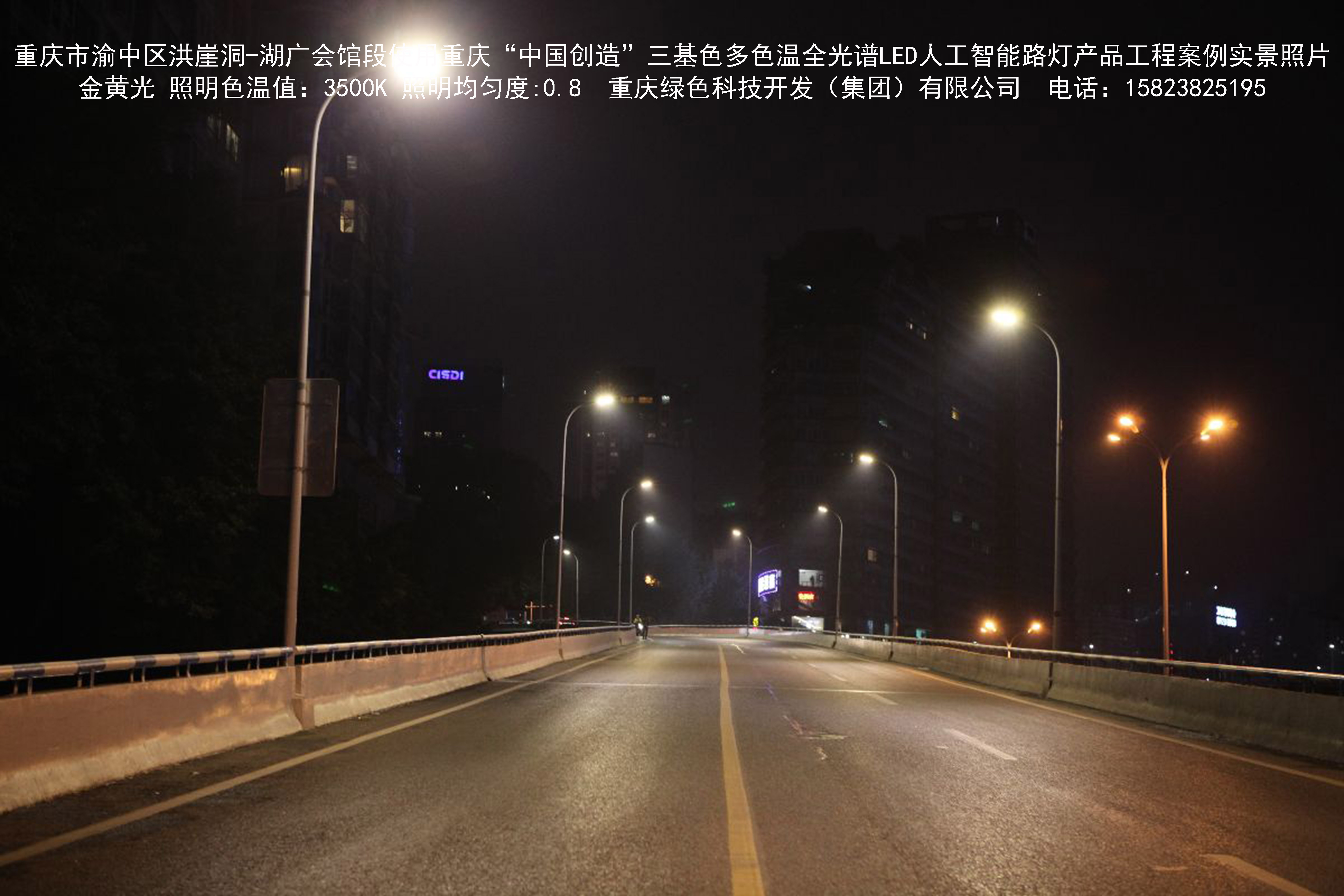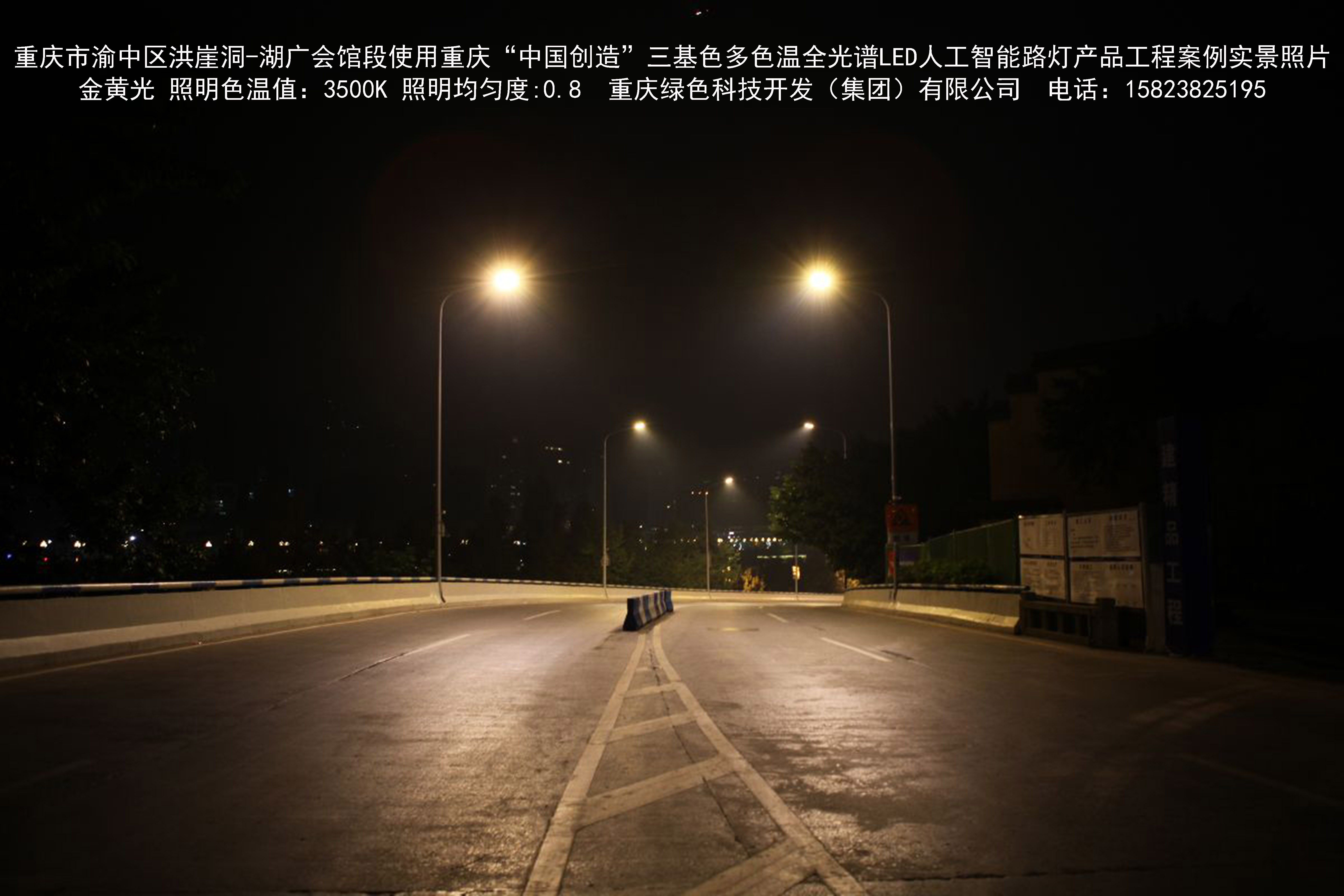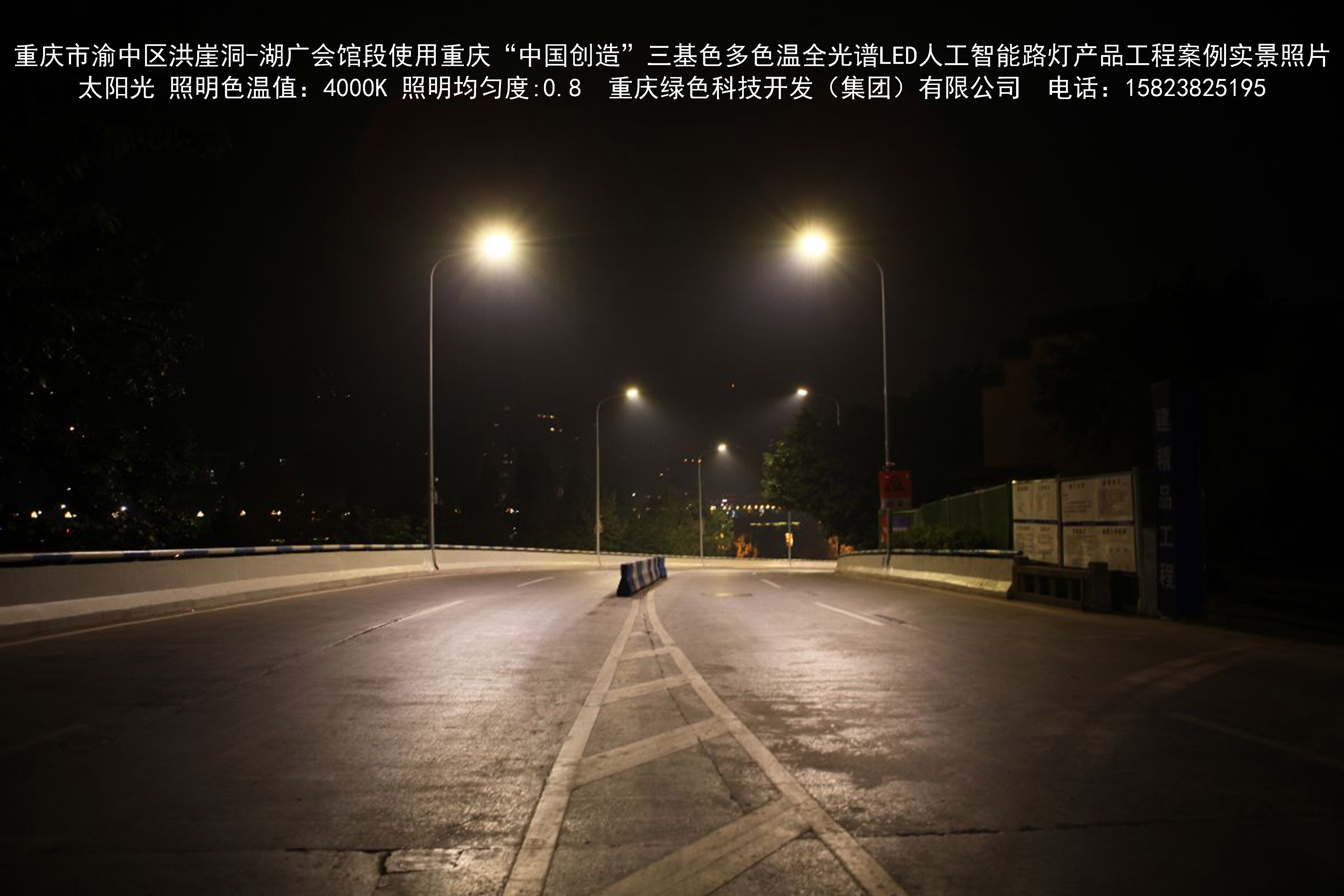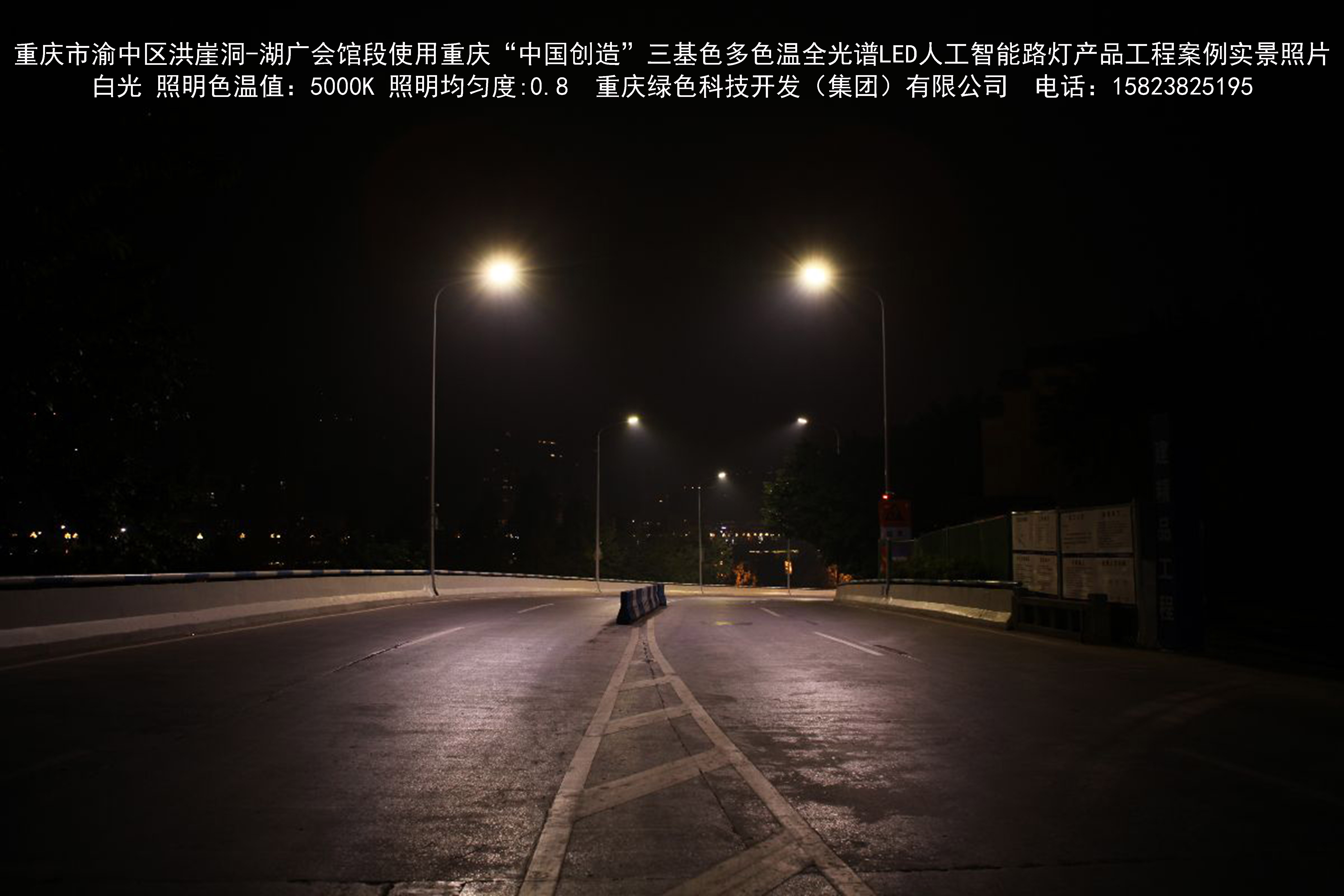 2018年12月,重庆市城市照明管理局使用我司自主研发制造的重庆“中国创造”三基色多色温全光谱LED人工智能路灯系列产品,实施了渝中区市政设施品质提升工程。该工程已全面竣工。工程实施后,极大地提高了城市照明清晰度、灯光均匀度、舒适度。通过智能终端实现单灯感知、线缆防盗报警,与原高压钠灯相比,节能率60%以上,有效解决了关闭控制回路或间隔关灯方式造成的照明暗区,确保行人和车辆通行的安全,实现城市路灯照明系统的智能化管理,推进了智慧城市建设。