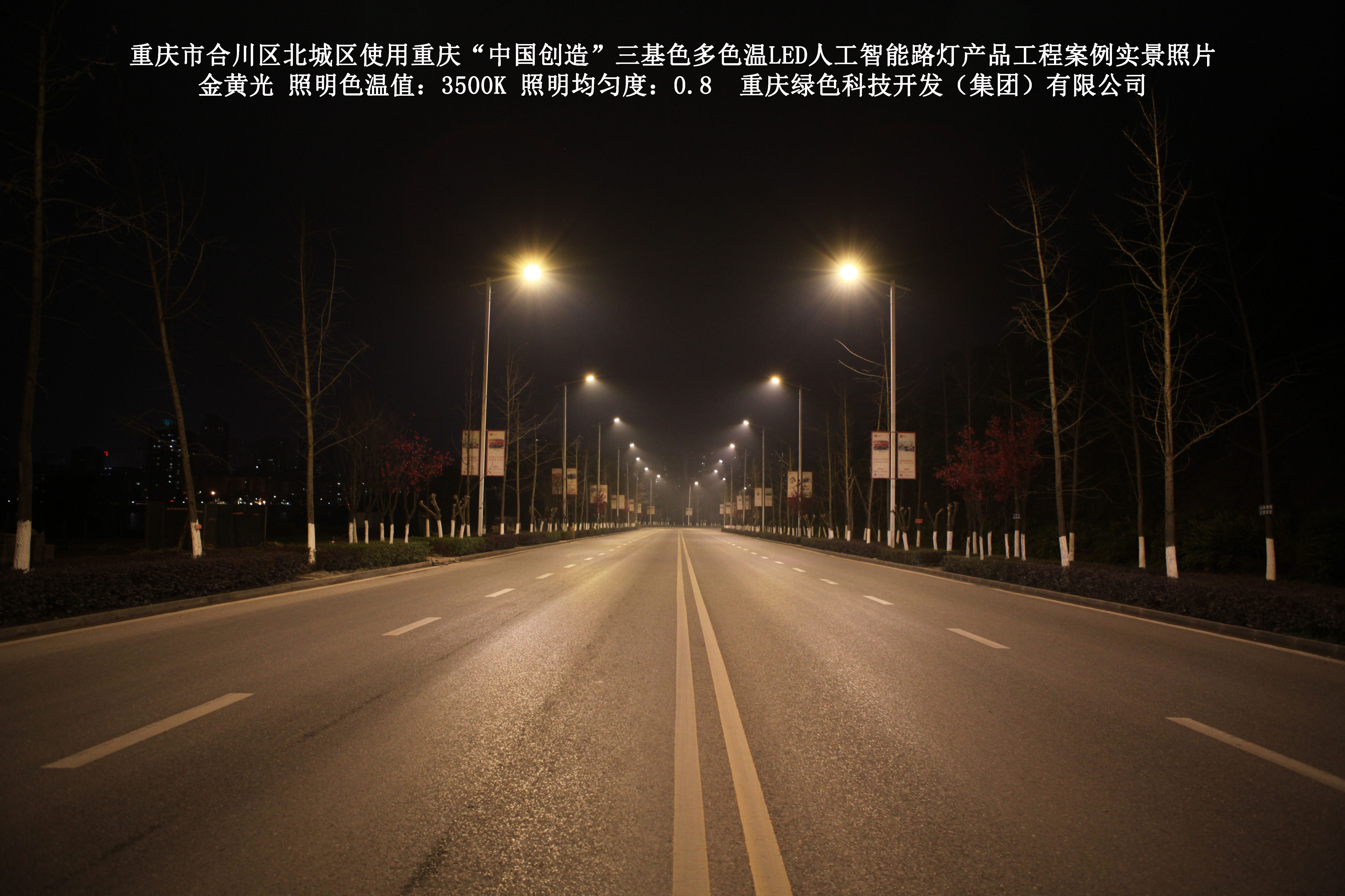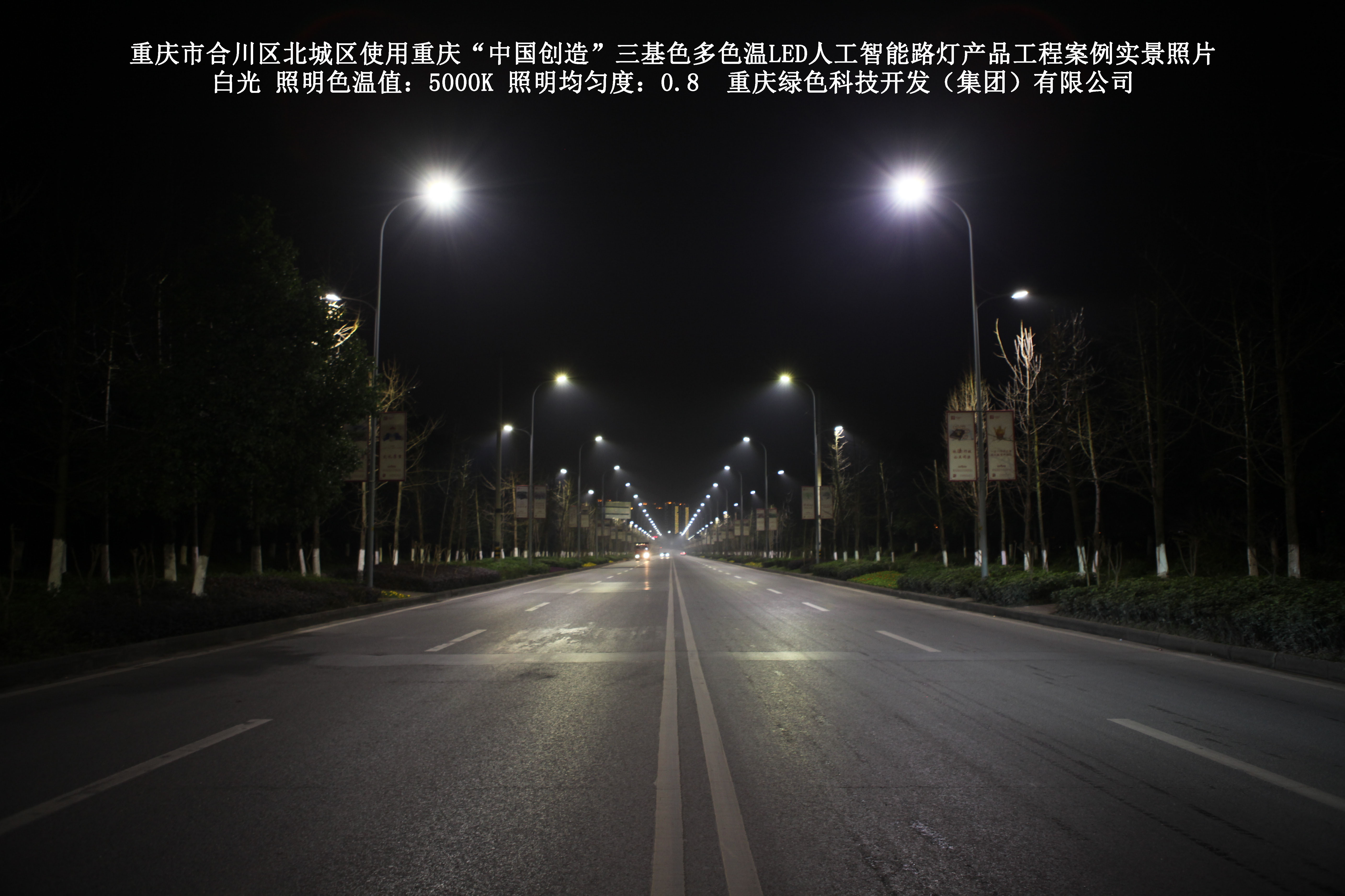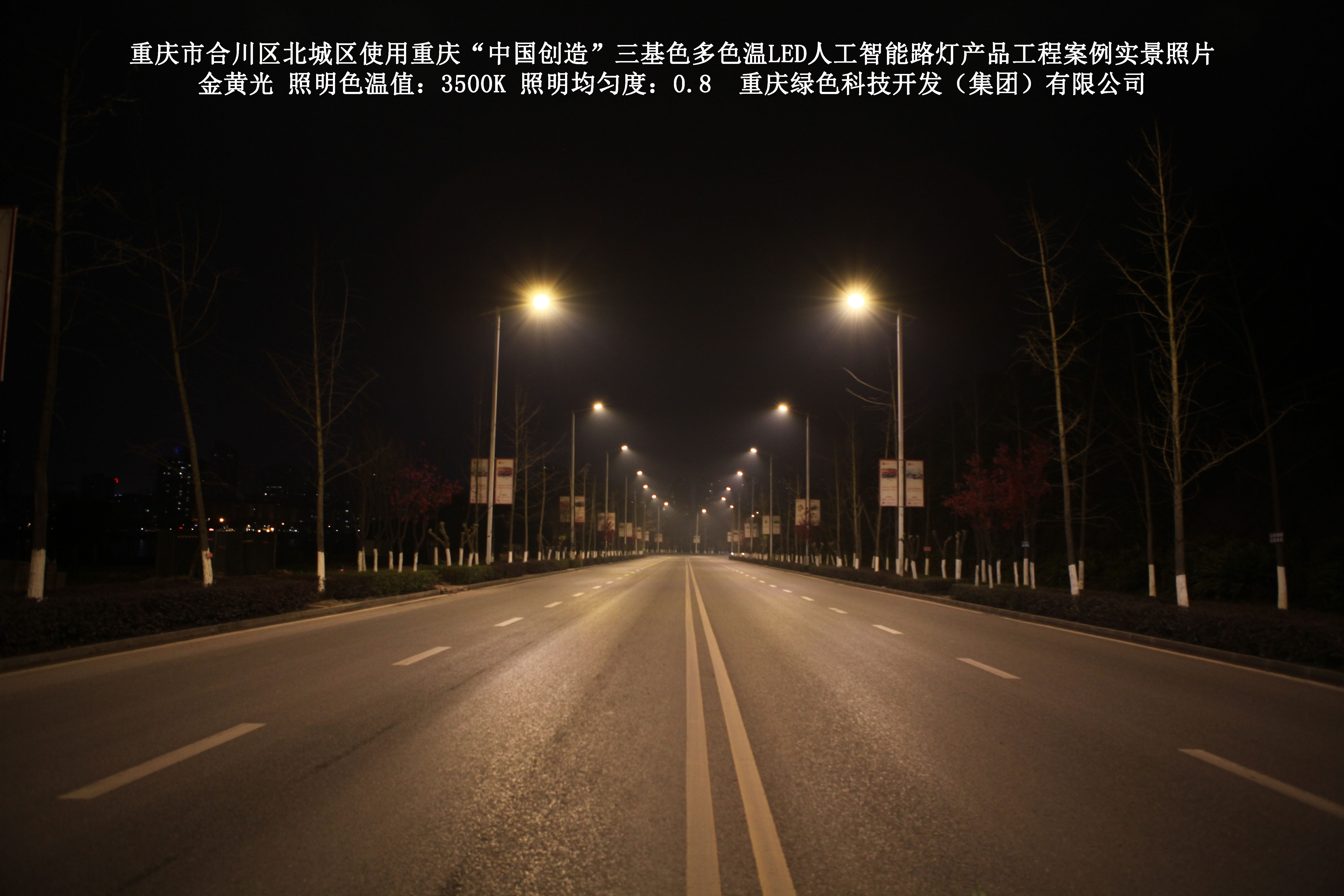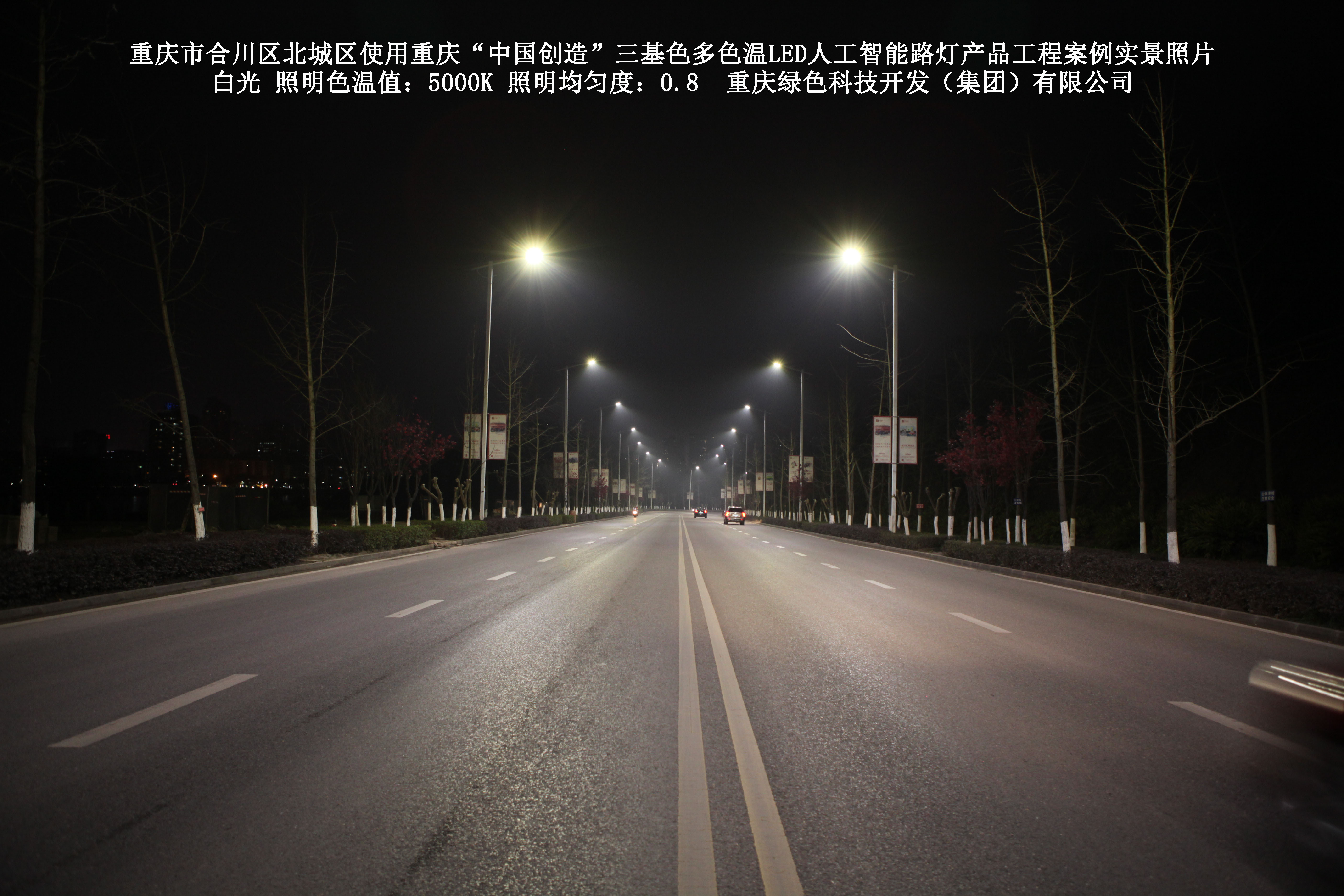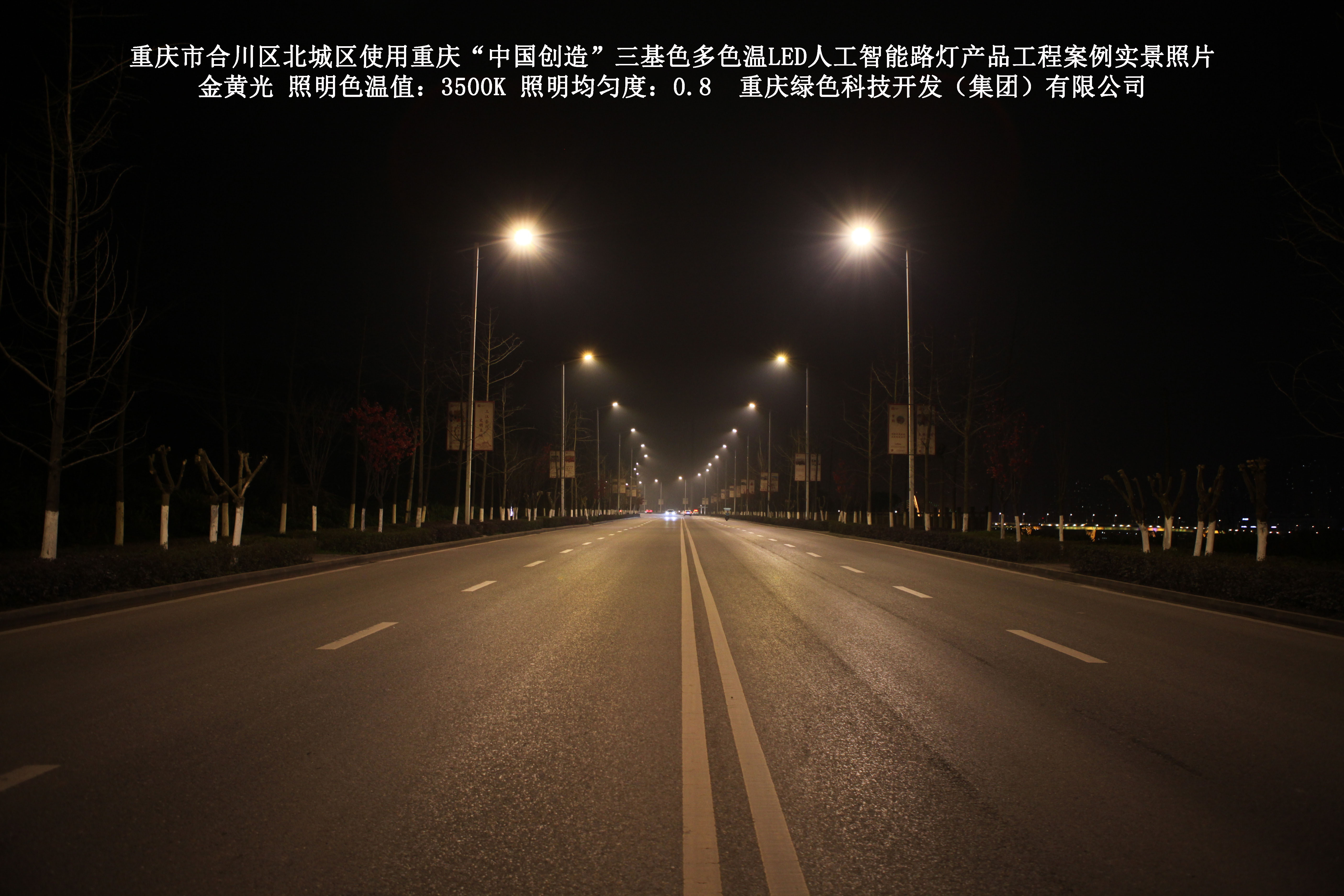 2019年1月,重庆市合川区城市管理局使用了我司研发制造的重庆“中国创造”三基色多色温LED人工智能路灯5144盏,对合川区北城区实施了绿色照明科技节能改造工程,该工程已全面竣工。工程实施后,极大地提高了合川区北城区城市照明清晰度、灯光均匀度、舒适度。通过智能终端实现单灯感知、线缆防盗报警,与原高压钠灯相比,节能率60%以上,有效解决了关闭控制回路或间隔关灯方式造成的照明暗区,确保行人和车辆通行的安全,实现城市路灯照明系统的智能化管理,推进了智慧城市建设。