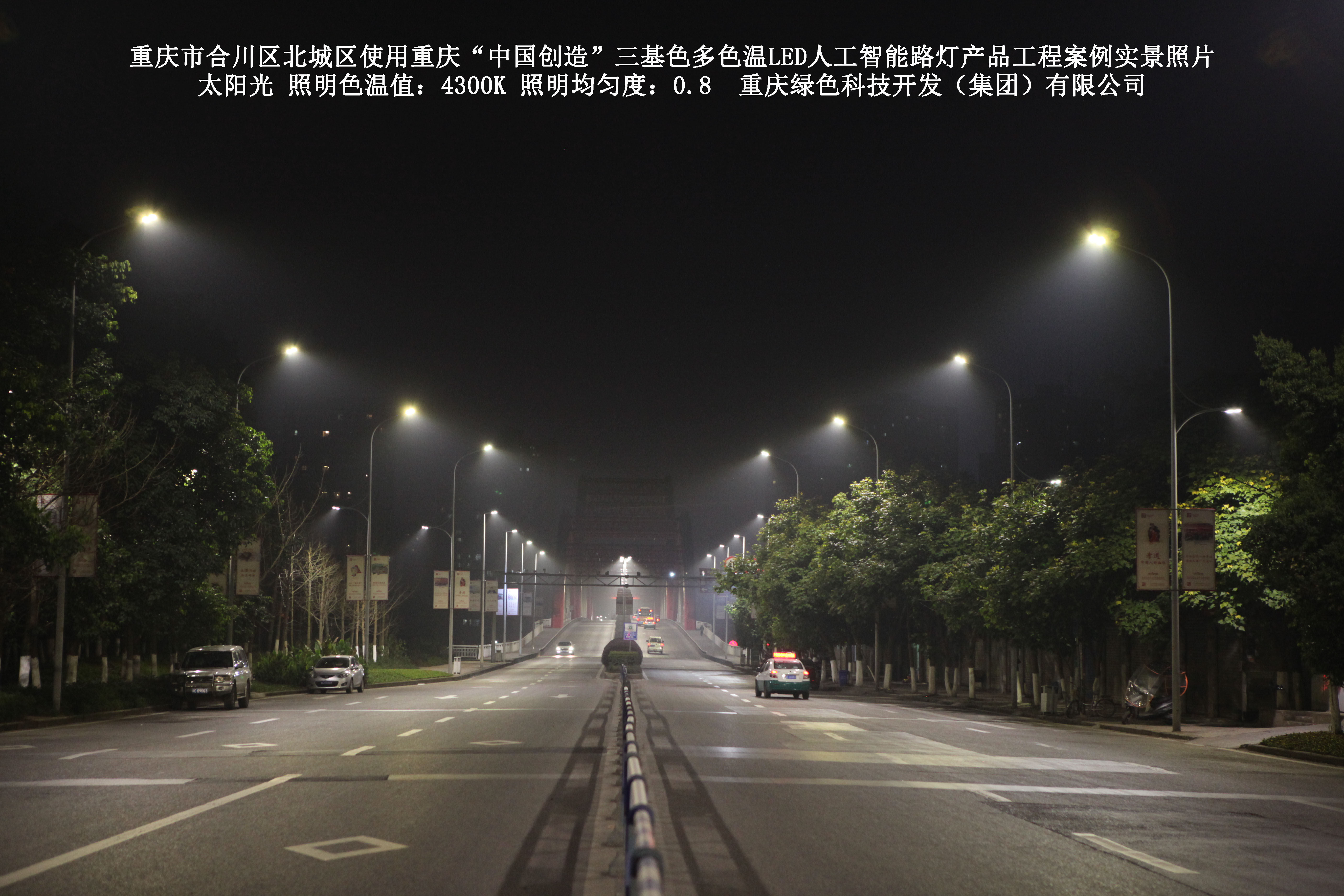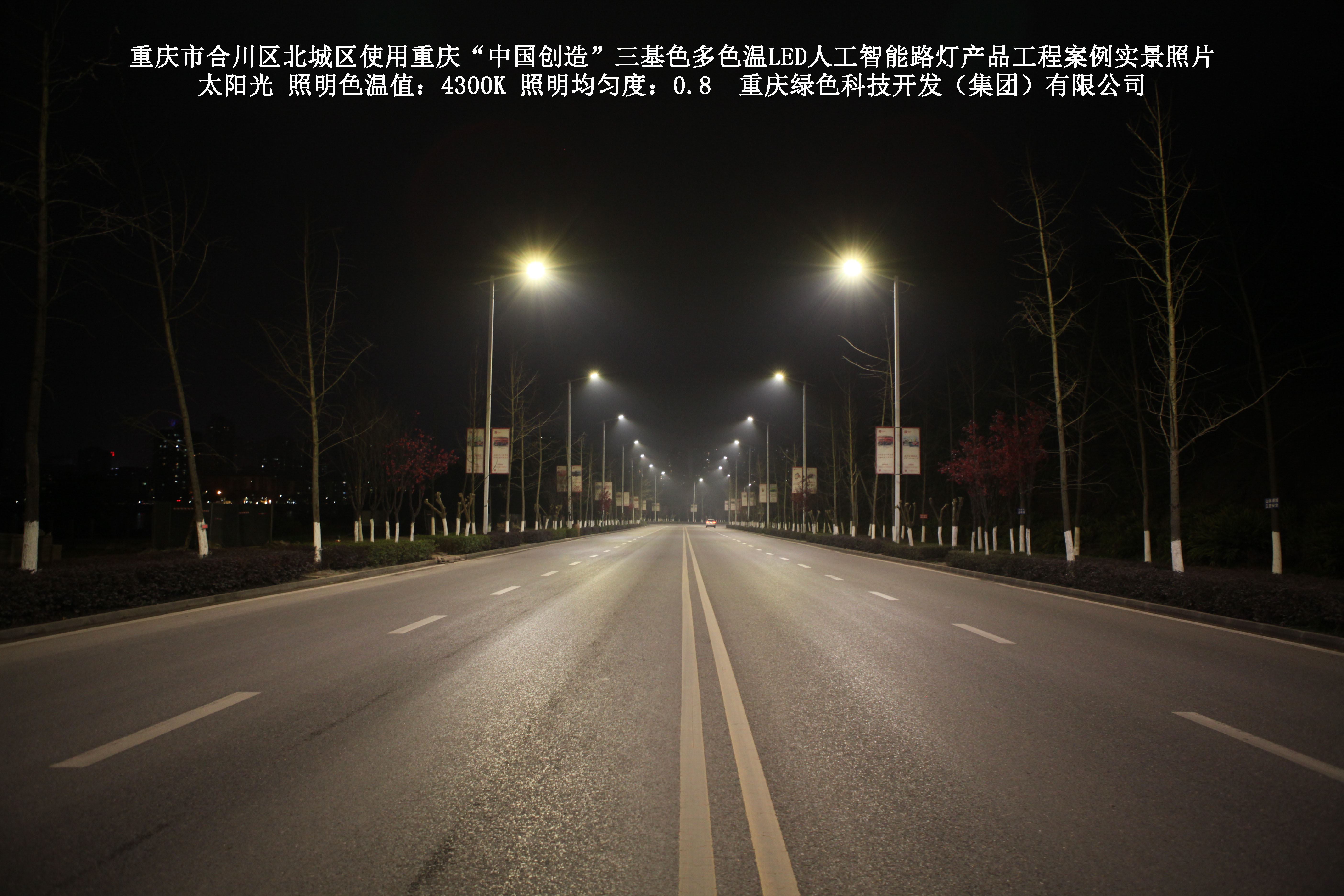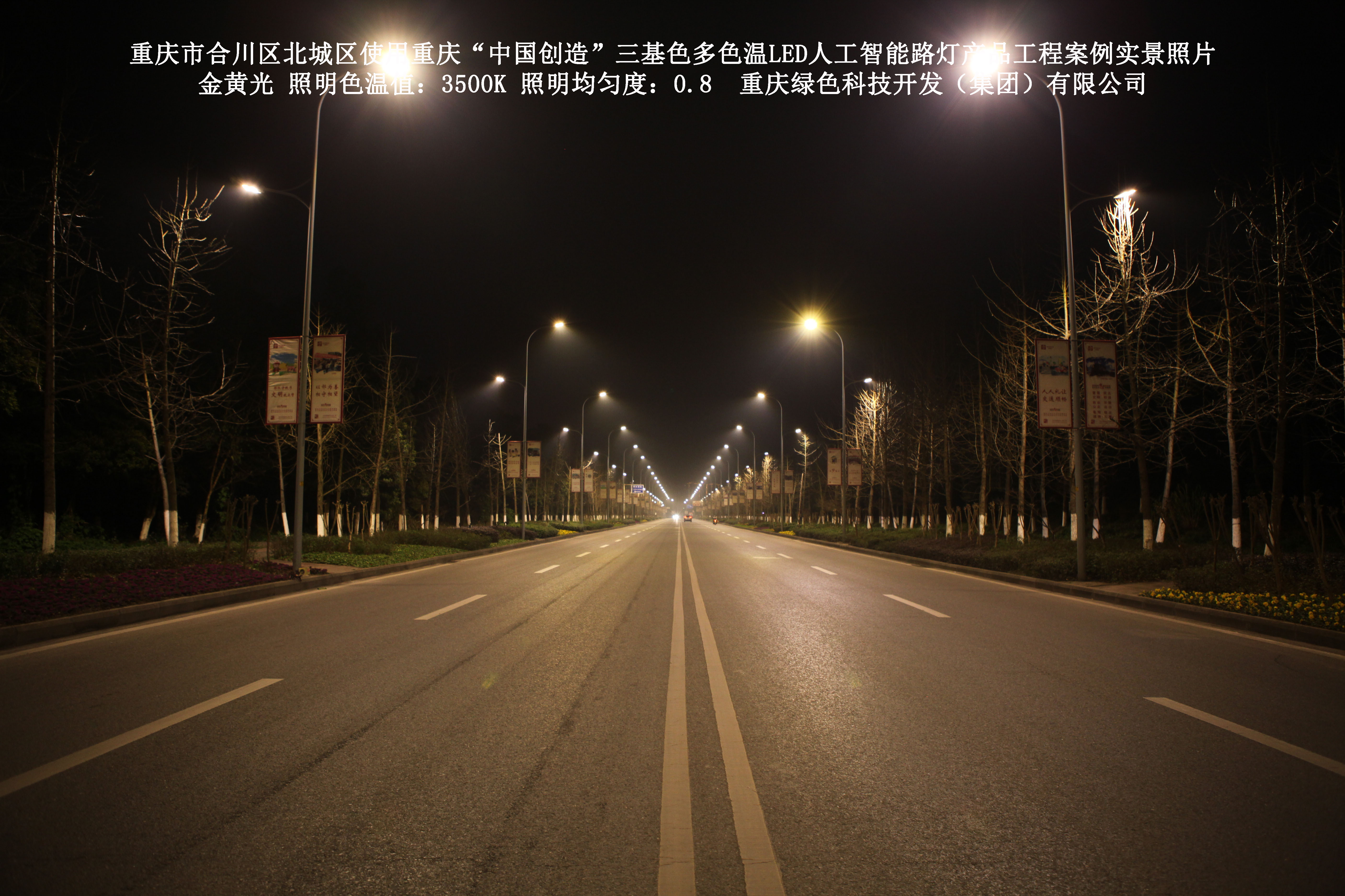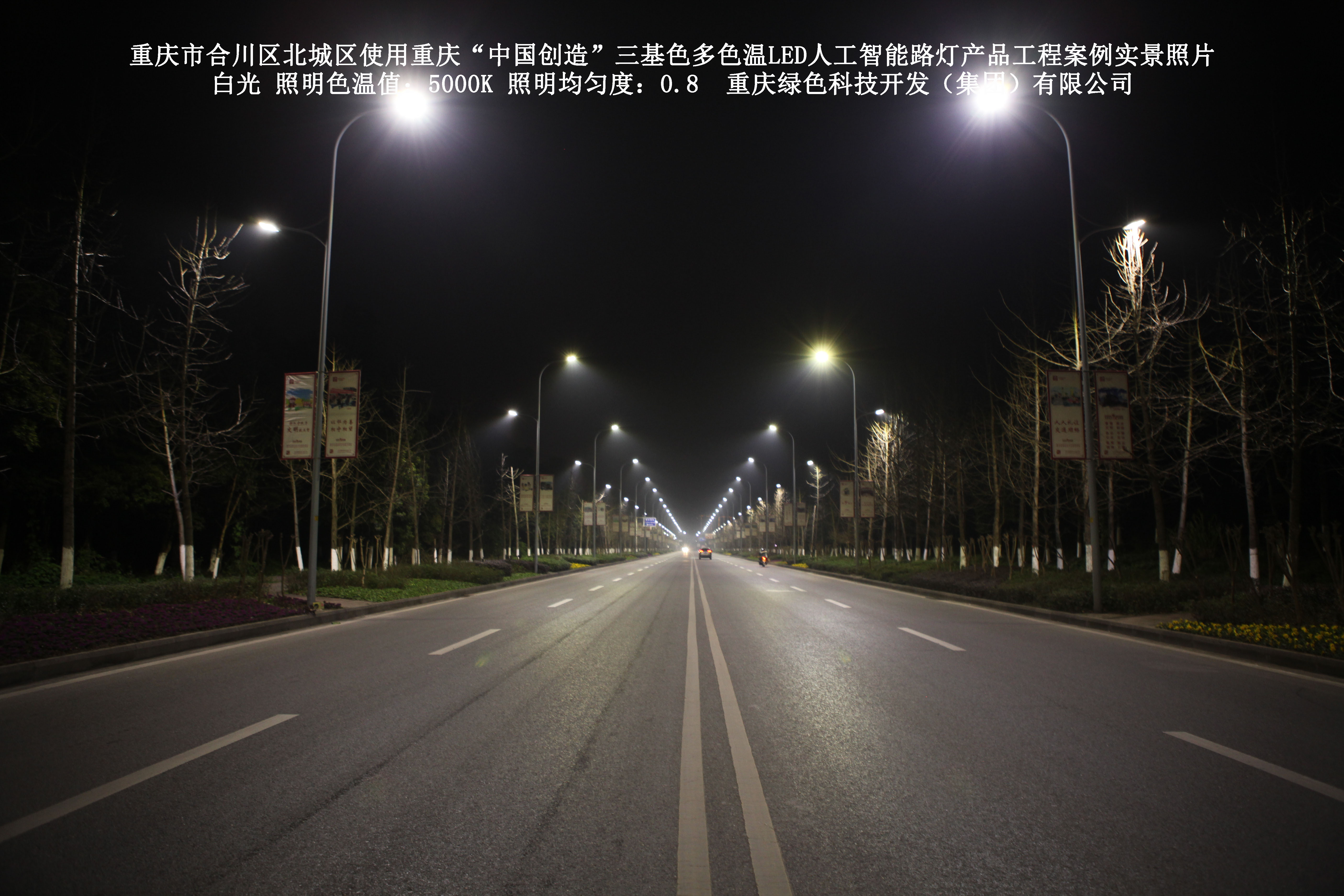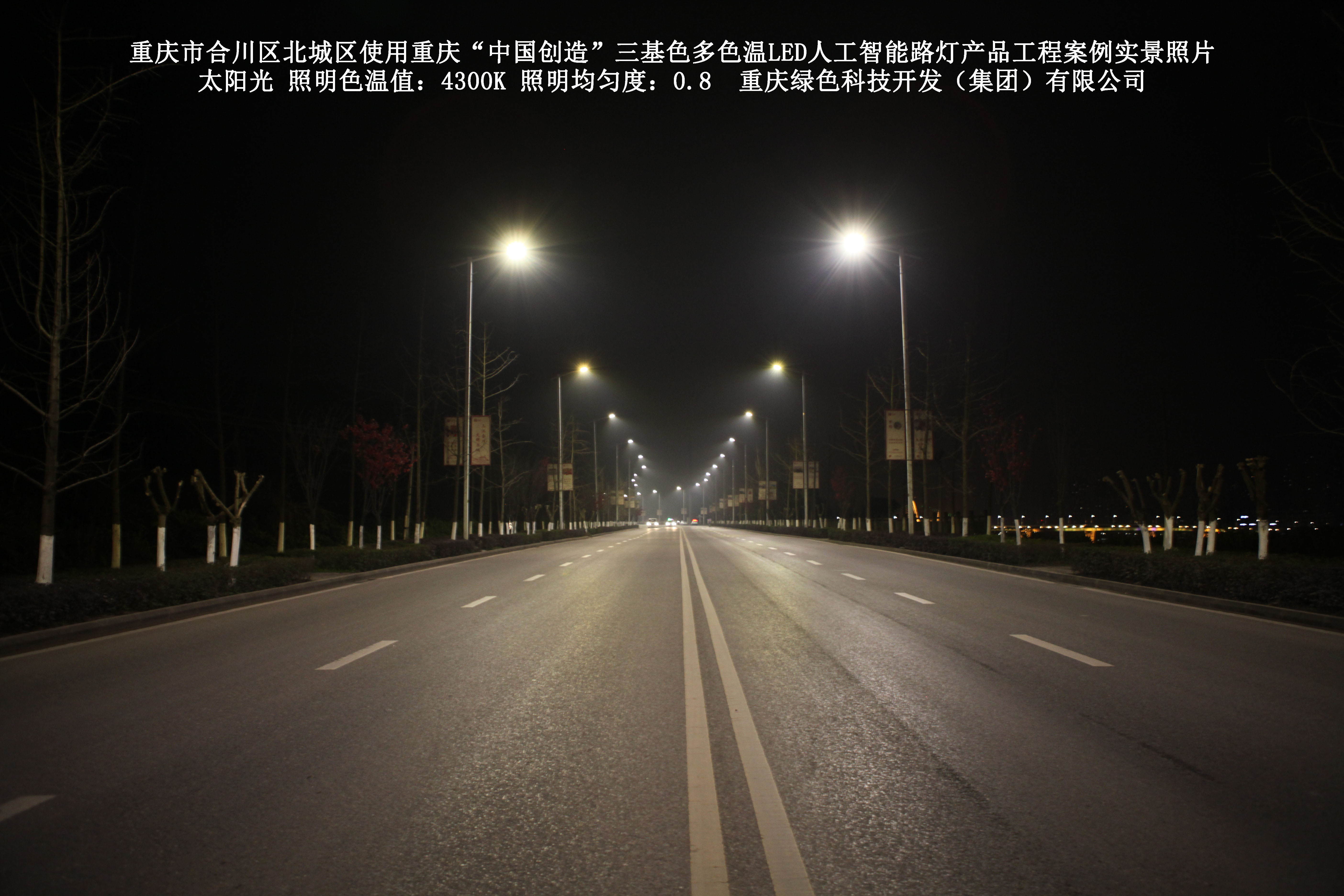 2019年1月,重庆市合川区城市管理局使用了我司研发制造的重庆“中国创造”三基色多色温LED人工智能路灯5144盏,对合川区北城区实施了绿色照明科技节能改造工程,该工程已全面竣工。工程实施后,极大地提高了合川区北城区城市照明清晰度、灯光均匀度、舒适度。通过智能终端实现单灯感知、线缆防盗报警,与原高压钠灯相比,节能率60%以上,有效解决了关闭控制回路或间隔关灯方式造成的照明暗区,确保行人和车辆通行的安全,实现城市路灯照明系统的智能化管理,推进了智慧城市建设。