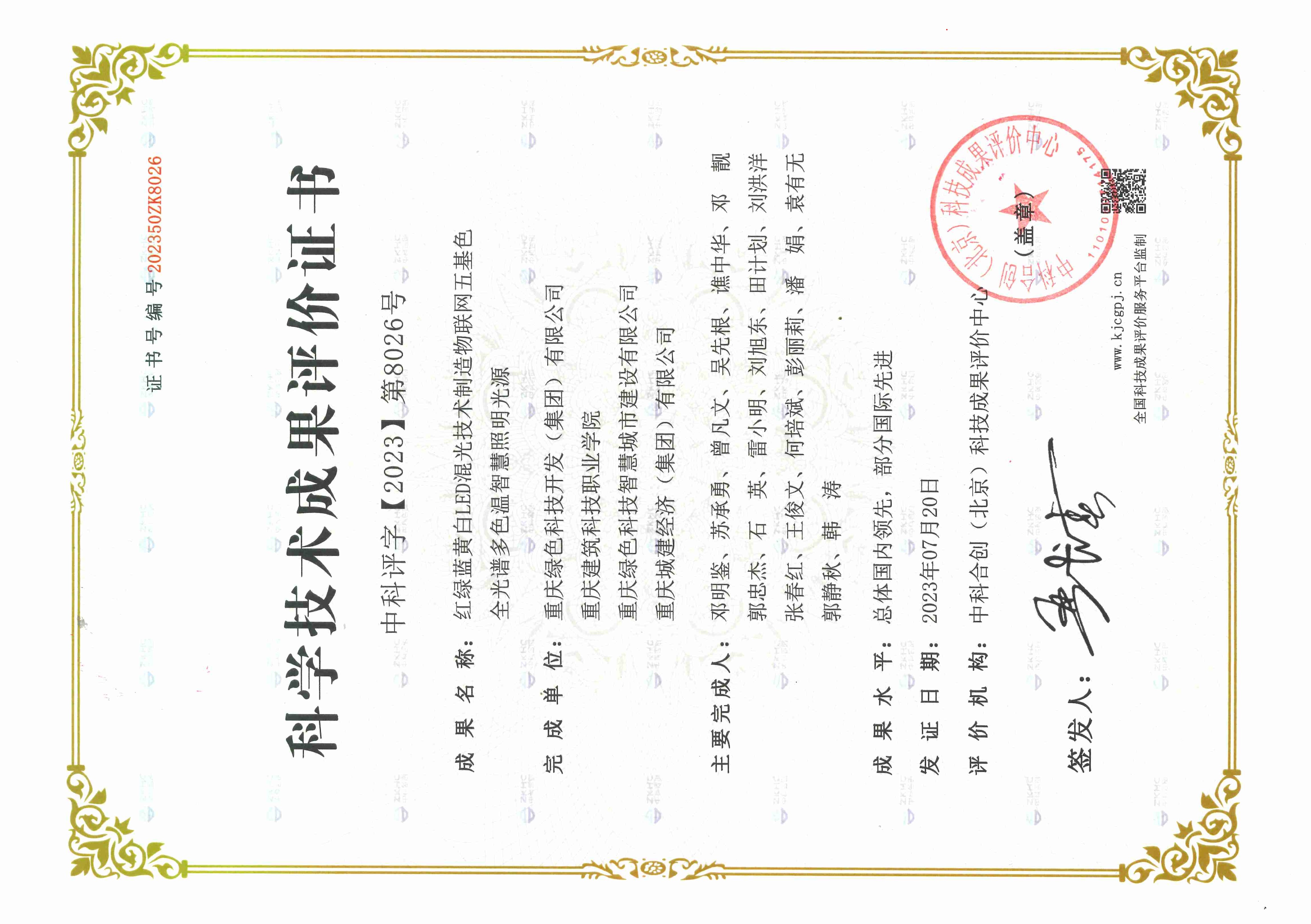 2023年7月11日,中科合创(北京)科技成果评价中心组织专家,在北京对我司“红绿蓝黄白LED混光技术制造物联网五基色全光谱多色温智慧照明光源”项目进行了科技成果评价。